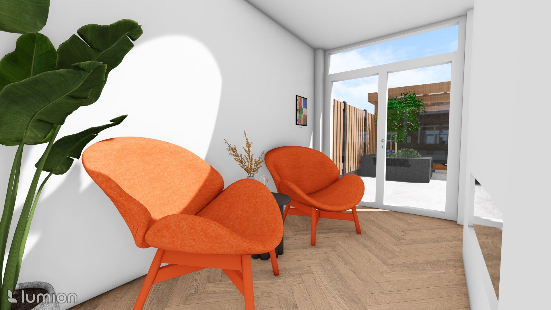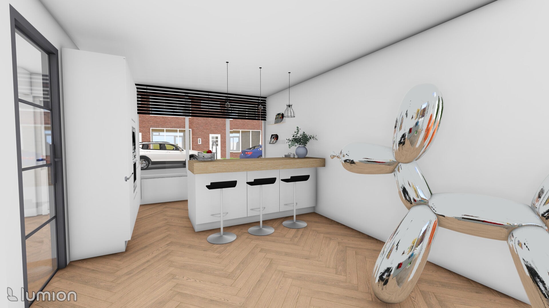 Het interieur was ook een belangrijk onderdeel van het ontwerpproces. We hebben gekozen voor een simpele kleurenstelling met verschillende eyecatchers die sfeer in de kamers brengen. Op deze manier wordt elk hoekje van het huis ook interessant omdat er telkens iets nieuws gebeurt. Zo hebben we ervoor gekozen om een groot spiegelend stuk kunst in het midden van de kamer te zetten om zo de vele kleuren samenvoegen in een kunstwerk.