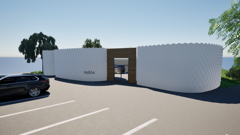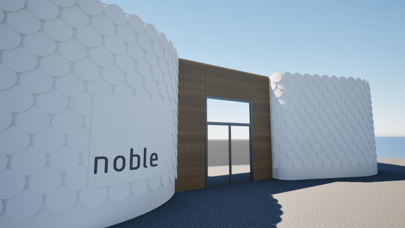 We hebben ervoor gekozen om Noble een gesloten voorgevel te geven. Op deze manier sluiten we de buiten wereld af van het restaurant en leggen we de focus op het uitzicht op de Bossche broek. De gevel is opgebouwd uit meer dan 1000 cirkels die samen een structuur maken. We hebben gekozen voor dit patroon voor een knipoog naar de natuur. De vele cirkels samen met de ronden moeten schubben van een vis voorstellen. We hebben ervoor gekozen om een neutrale kleurenstelling te gebruiken. Dit hebben we gedaan zodat het vanaf een afstand niet speciaal eruitziet, terwijl als je dichterbij komt de fantastische schubbenstructuur snel zal opvallen. Voor de rest hebben we gebruik gemaakt van hout en zwarten accenten.
