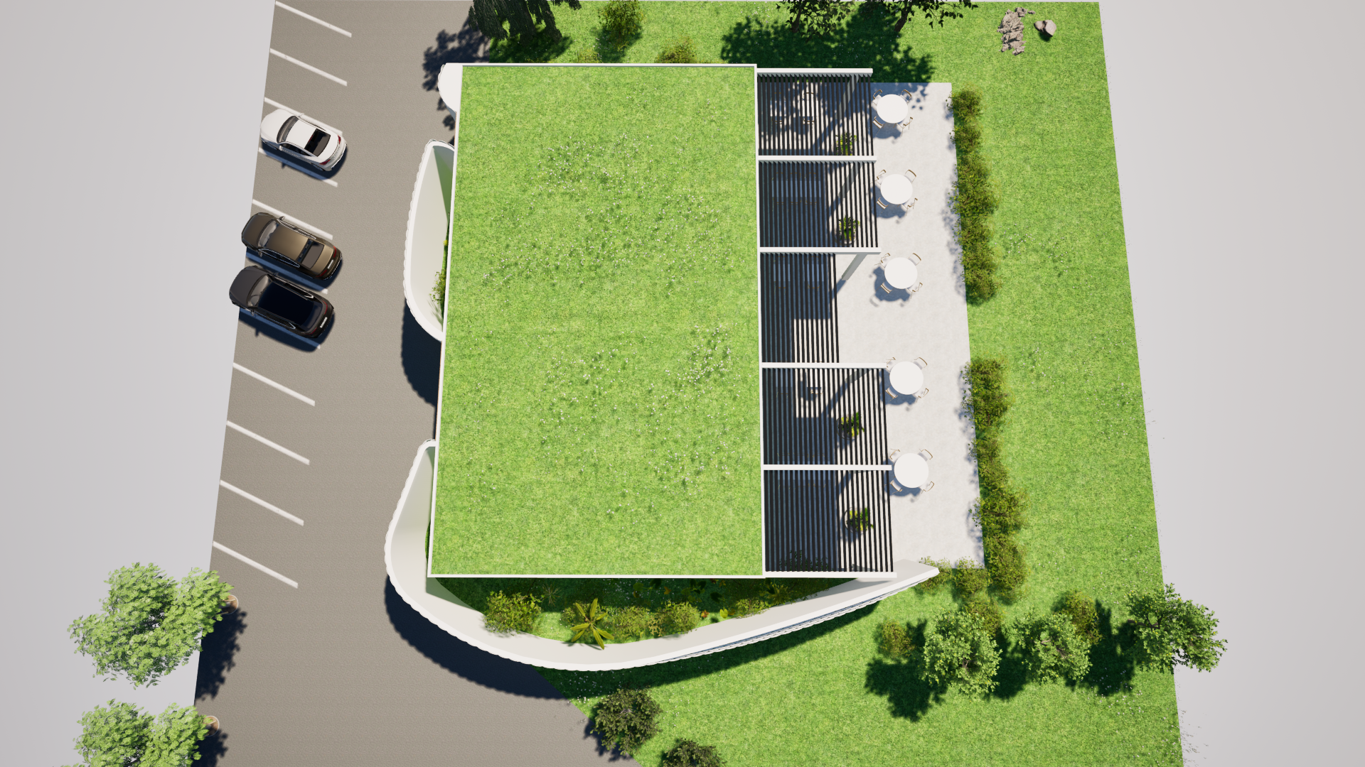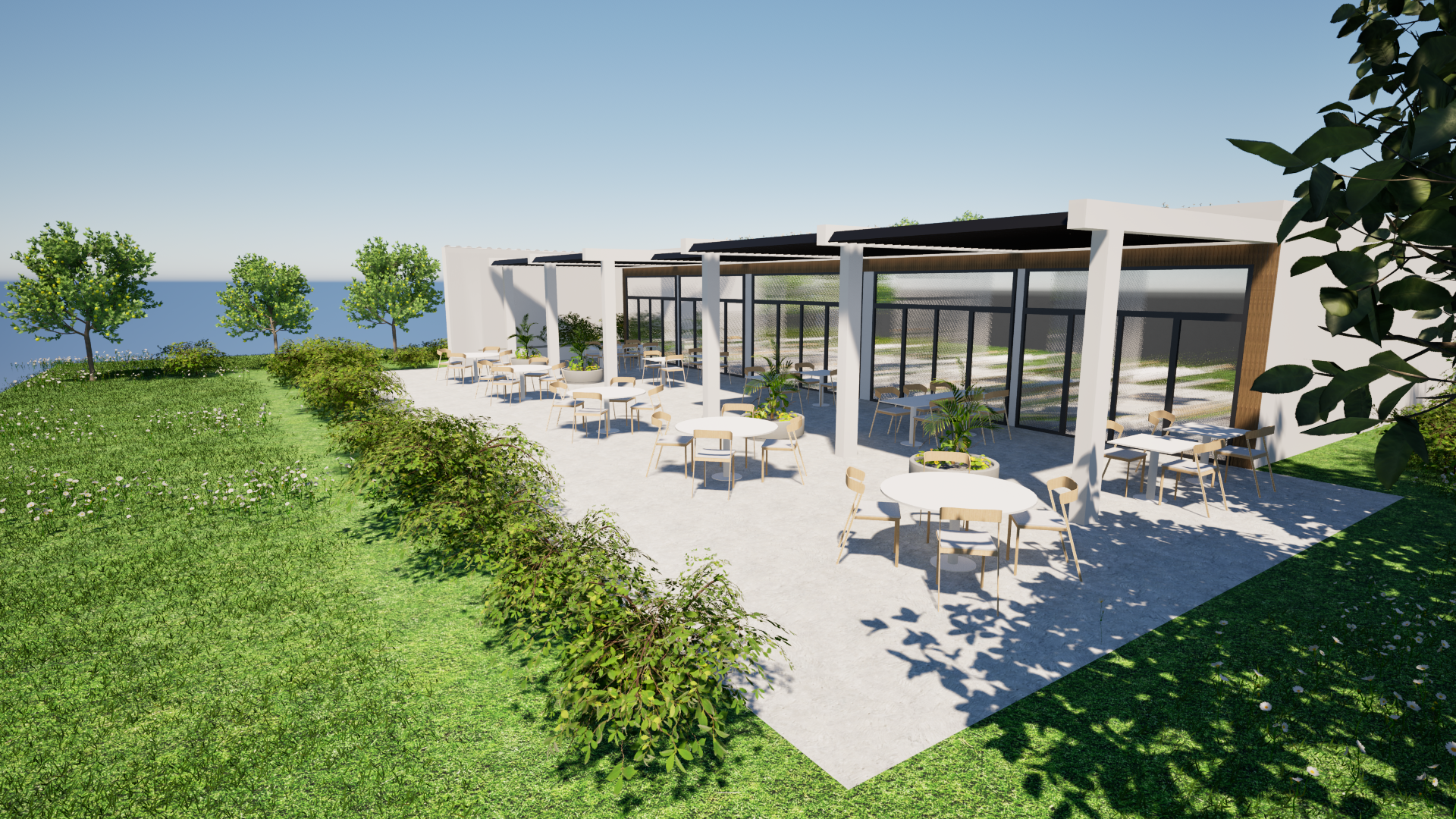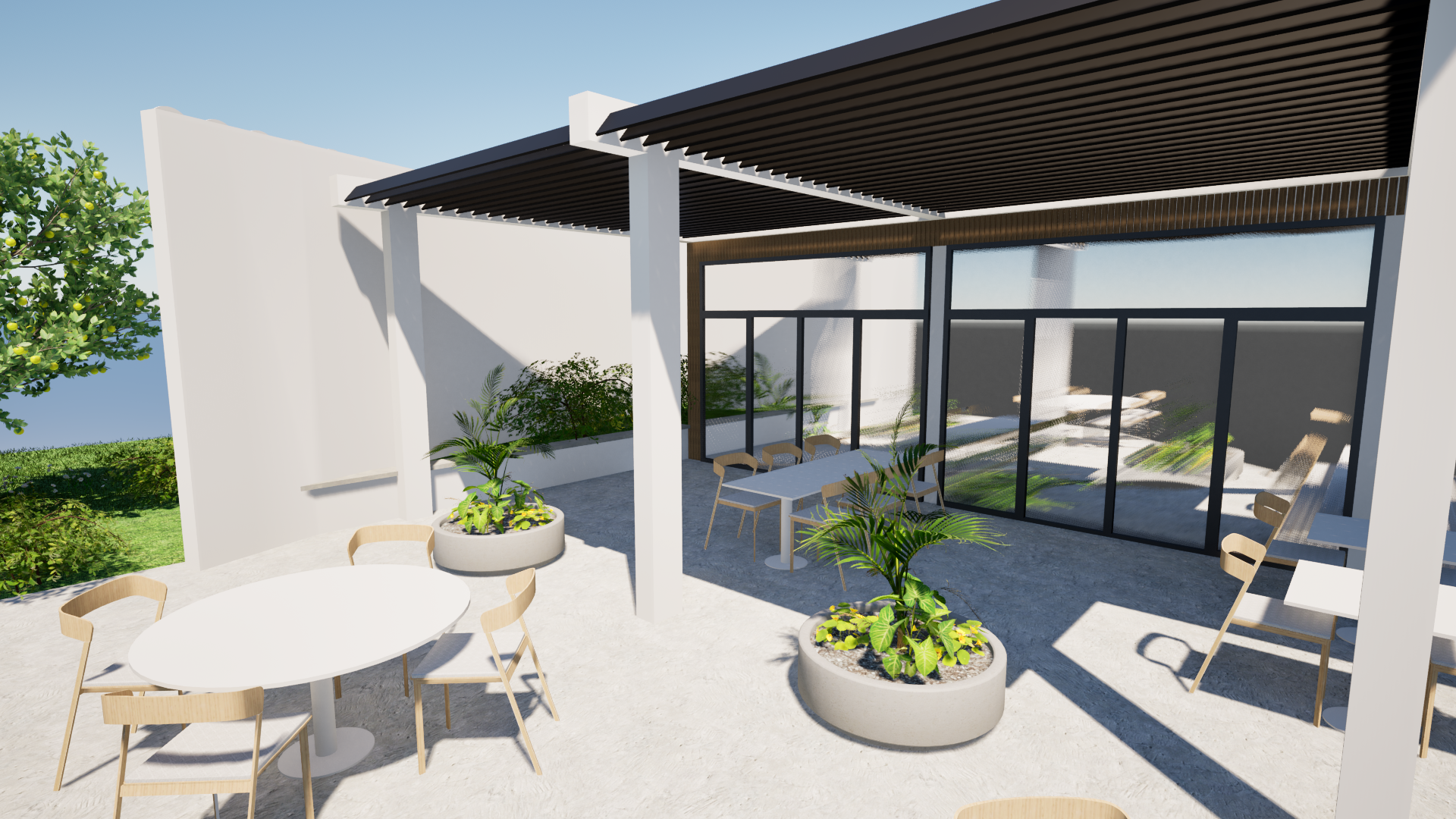 Achter de ronden gevels schuilen binnenplaatsen gevuld met tropische planten en bloemen. Op deze manier willen we de natuur het restaurant inbrengen en een mooi uitzicht creëren. Daardoor verstoppen we het drukke straatbeeld wat buiten afspeelt. Ook geeft het een gezellige sfeer en geeft het veel rust in het restaurant.