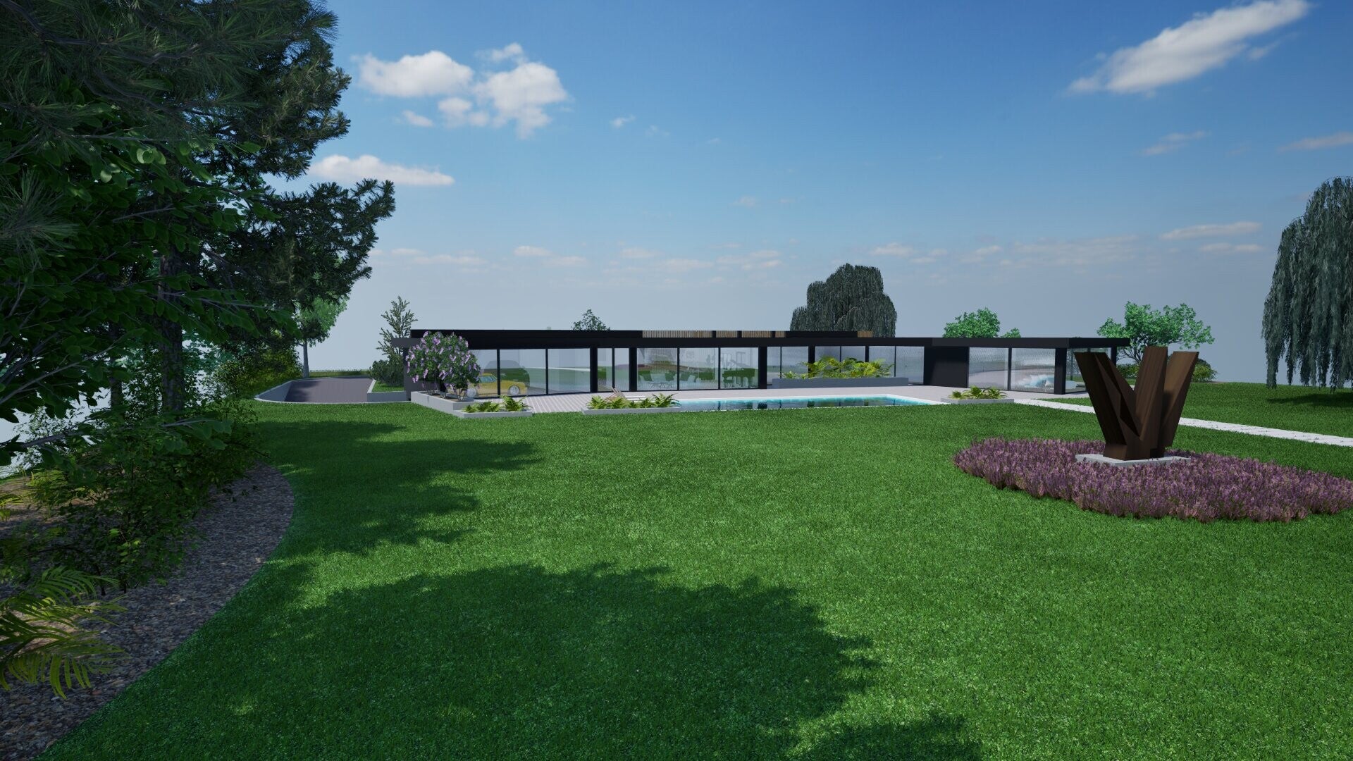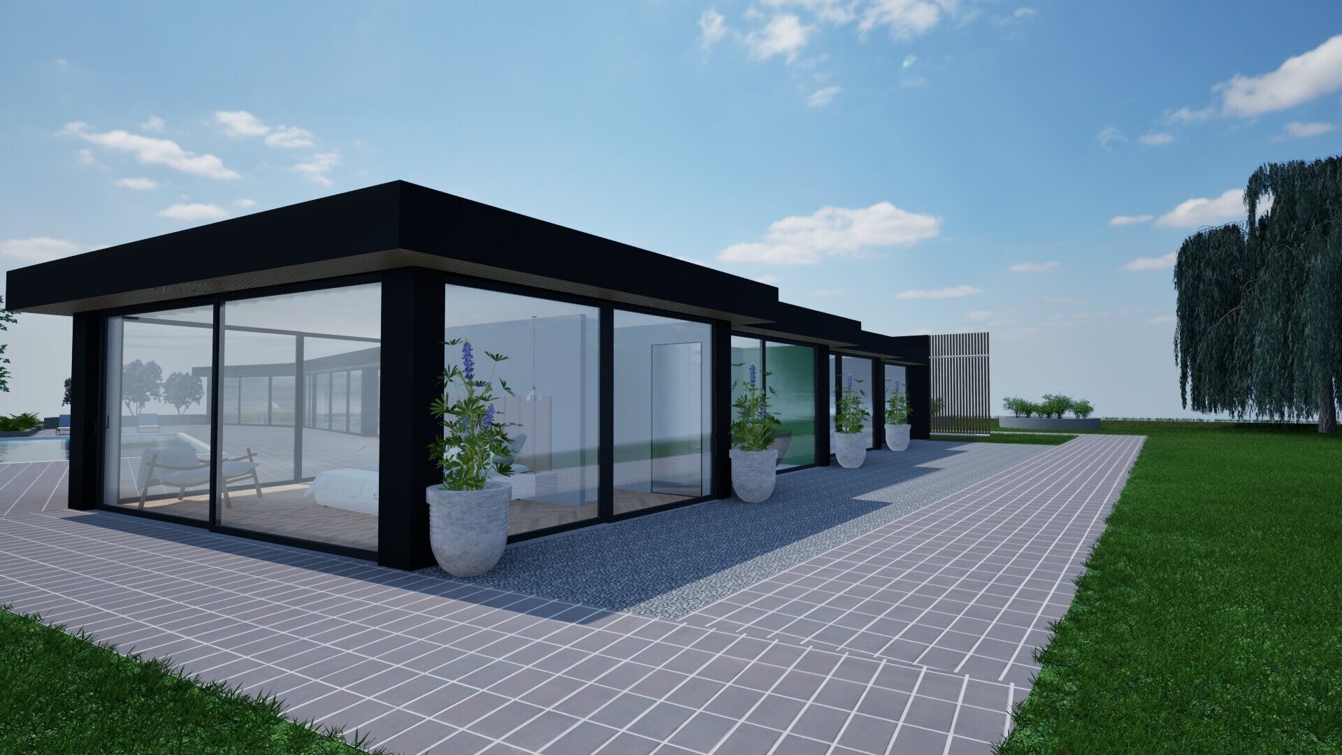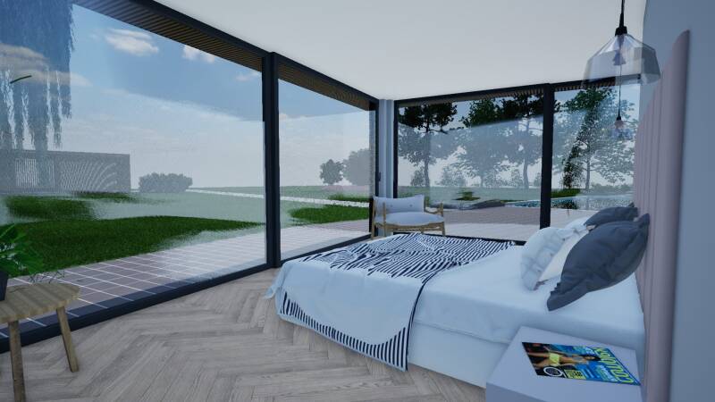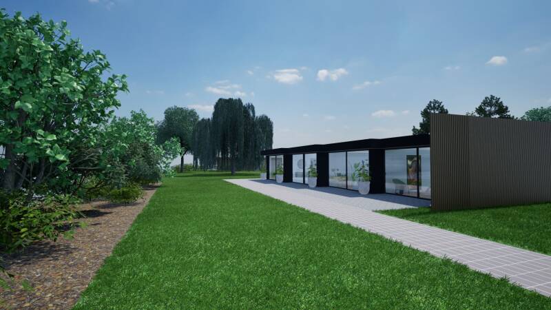 We hebben gekozen voor een Scandinavische stijl. Dit vinden we goed passen in de natuurlijke omgeving. Dit zorgt dat het huis goed wegvalt en niet opvallend is.