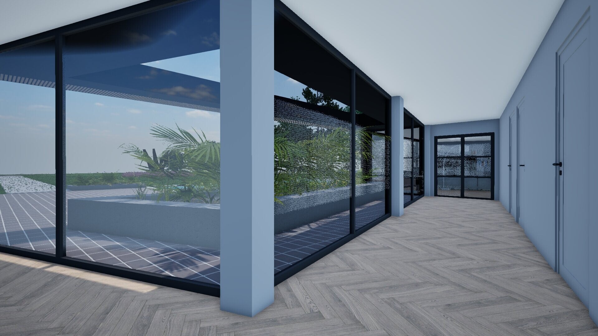 Het huis is opgebouwd uit verschillende blokken die samen het huis vormen. Voor elk blok hebben we een ander doeleinde gekozen. Bijvoorbeeld slaapkamers, leefruimte en garage. We hebben gekozen om een afgesloten voorgevel te maken. Deze is uit meer dan 400 verschillende houten latjes opgebouwd met verschillende tussenruimtes om op deze manier een op verschillende plekken een doorkijk te creëren. Op deze manier is de gevel dicht maar kan er alsnog veel licht doorheen komen. We hebben gekozen voor een dichte gevel om veel privacy te creëren. Op deze manier hoef je je niet aangekeken te voelen.