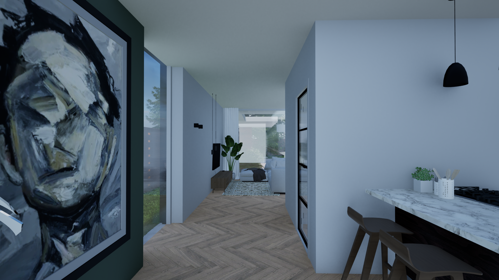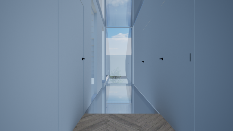 De binnen kant vinden we ook erg belangrijk bij Bulten Designs. We hebben hier bij villa Schutskamp een hele speciale techniek gebruikt wat nog nooit eerder in een woonhuis is gedaan. Dit is terug te zien in de hal. Hier zie je de grote hoge ramen die van benende helemaal naar boven strekken. Binnen wouden we dit effect doortrekken. Daarom hebben we op de verschillende verdiepingen een glazen vloer geplaatst. Dit zorgt ervoor dat je door alle verdiepingen heen kan kijken. Boven in het plafond hebben we een groot dakraam gemaakt en op deze manier kan je vanaf de begaande grond door alle verdiepingen heen naar de hemel kijken. Door de hoeveelheid glas samen met de witte muren krijg je een hele ruimtelijke sfeer en vooral heel veel natuurlijk licht.