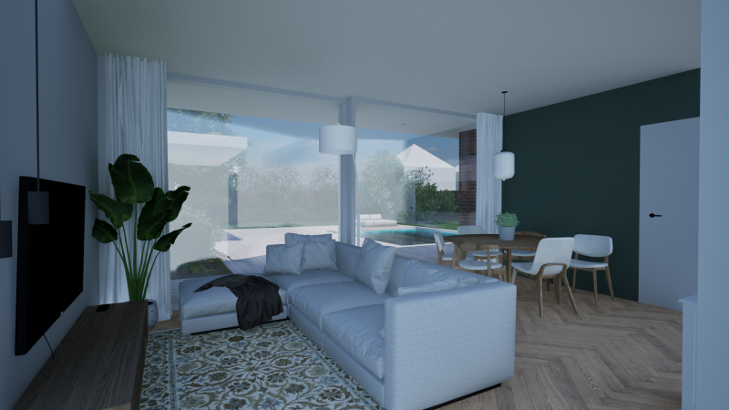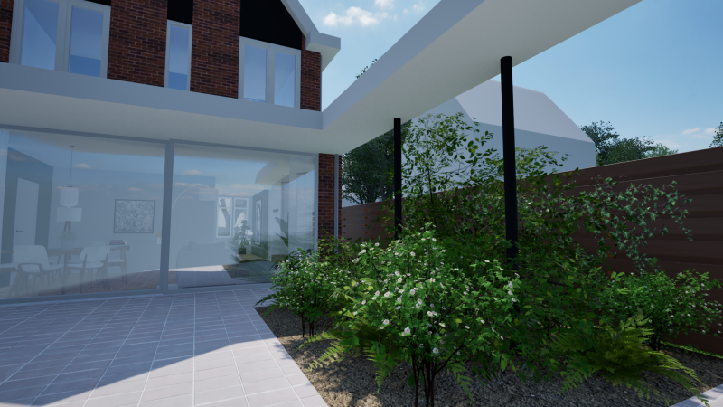 Natuur is ook een belangrijk punt in onze ontwerpen, daarom hebben we gekozen om ook hier veel plek voor te bieden en het ook echt in het ontwerp mee te nemen. Hier hebben we gekozen om een groot vlak voor planten te maken. Op deze manier zorgen we dat je vanuit binnen ook een connectie hebt met de natuur. We hebben het overkapte deel hier ook door getrokken en op deze manier hebben we een mooie connectie gemaakt met de overkapping. De overkapping is gemetseld en bied voor veel verschillende doeleinden. Ook hebben we aan de achterkant ruimte gemaakt voor een buitendouche en installaties voor het zwembad.
