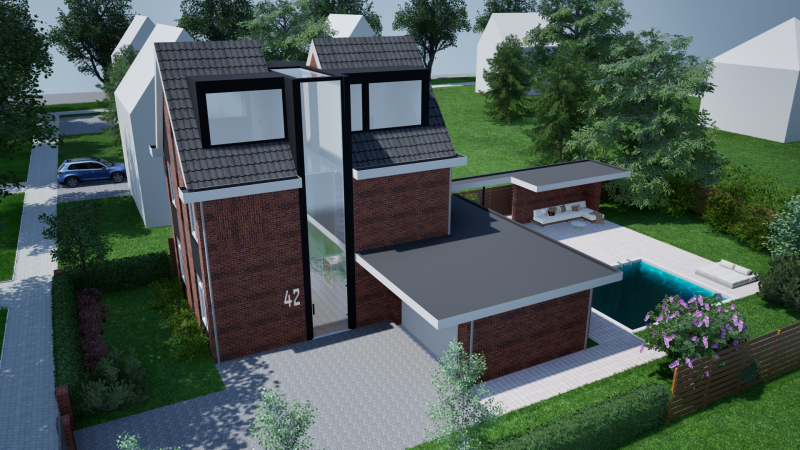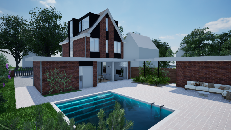 Voor de buiten kant hebben we een mix van simpele rode bakstenen en een strakke betonen gevel, deze mix zorgt voor een goed samenspeel tussen de jaren dertig stijl en de moderne architectuur. In de gemetselde gevel zal je ook mooie details zien. Bijvoorbeeld hebben we aan de rechter zijgevel een groot vlak waar de bakstenen verticaal zijn geplaats. Op deze manier zorgen we dat de grote vlakken van baksteen minder saai worden en door dit soort details worden gebroken. Dit soort details kan je ook terugvinden in de gemetselde hekpijlers en in de overkapping.